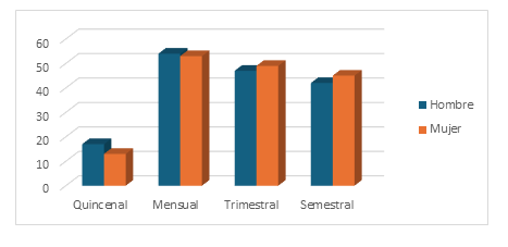 Evaluando el comportamiento del consumo en los residentes encuestados, se encontró que la frecuencia de compra de prendas de vestir es mensual, seguida de la compra cada tres meses. Tan solo un grupo pequeño manifiesta hacer compras con una periodicidad quincenal. En relación con el género, se evidencia que no hay mayores diferencias en la frecuencia de compra para cada uno de estos. (Figura 1).