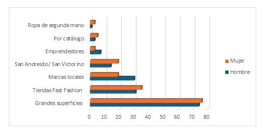 La Figura 2 presenta los sitios de preferencia para comprar, donde se evidencia que los almacenes de grandes superficies multimarca concentran mayor proporción de compra de prendas de vestir, seguidos de las tiendas de fast fashion y, en tercer lugar, por las tiendas de marcas locales.
