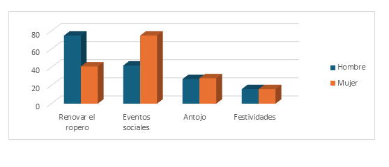 Para los encuestados, los principales motivos de comprar prendas de vestir radican en la intención de renovar el ropero, lo que indica que consideran que sus prendas de vestir no los satisface plenamente, conduciéndolos a una necesidad de compra. La siguiente razón de consumo es usar las nuevas prendas en eventos sociales; son pocos los individuos que compran sin un motivo específico, al igual que son pocos los que compran solo por festividades como el cumpleaños o la navidad (Figura 3). En el análisis por género, se evidencia que los hombres tienden a comprar más por la necesidad de renovar el ropero, mientras que las mujeres tienden a comprar cuando deben asistir a un evento social.