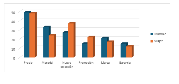 Las decisiones de compra están dadas principalmente por el precio y la tendencia de las nuevas colecciones, tal como lo muestra la Figura 4. Esta situación pone de manifiesto que el comportamiento de la compra se rige por bajos precios, nuevos diseños y promociones, características típicas del modelo fast fashion. En el caso de las mujeres, estos patrones muestran una mayor sensibilidad frente a las estrategias de marketing de las tiendas de moda. Respecto a los hombres, los factores que más influyen en sus decisiones de compra son los precios, el material, la marca y la garantía del producto.