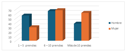 Respecto al número de prendas que cada individuo desecha al año, se encuentran entre seis y diez prendas, tanto para hombres como para mujeres; sin embargo, al realizar el análisis por género, se pone de manifiesto que las mujeres tienden a desechar más prendas de vestir en comparación con los hombres (Figura 6). El promedio de desecho, en general, corresponde a diez prendas por año.