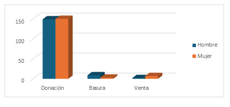 El análisis de la forma en que cada individuo gestiona los residuos textiles muestra que la donación es la principal forma de disposición, seguida por el depósito en canecas de basura y la comercialización como ropa de segunda mano. Tanto hombres como mujeres consideran adecuada la donación; sin embargo, son los hombres los que tienen mayor tendencia a disponer los productos en la basura, mientras que las mujeres consideran con mayor frecuencia la comercialización de estos (Figura 7).