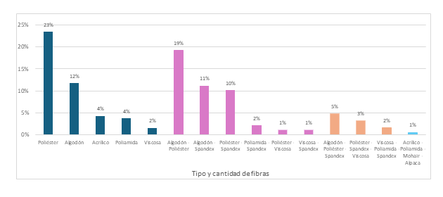 Para conocer el tipo y cantidad de fibras que componen la vestimenta de los bogotanos, se procedió a revisar las etiquetas de 205 prendas de vestir. Este análisis permitió identificar los materiales más comunes, el tipo de fibra (natural o sintética) y las combinaciones, que varían desde una sola fibra hasta la mezcla de cuatro tipos de fibras diferentes. El 43 % de la vestimenta está compuesta por materiales de un solo tipo de fibra, donde predomina el poliéster (sintético) y el algodón (natural), para el caso de composiciones de dos tipos de fibra predomina el algodón y el poliéster, el algodón y el spandex y el poliéster y el spandex.