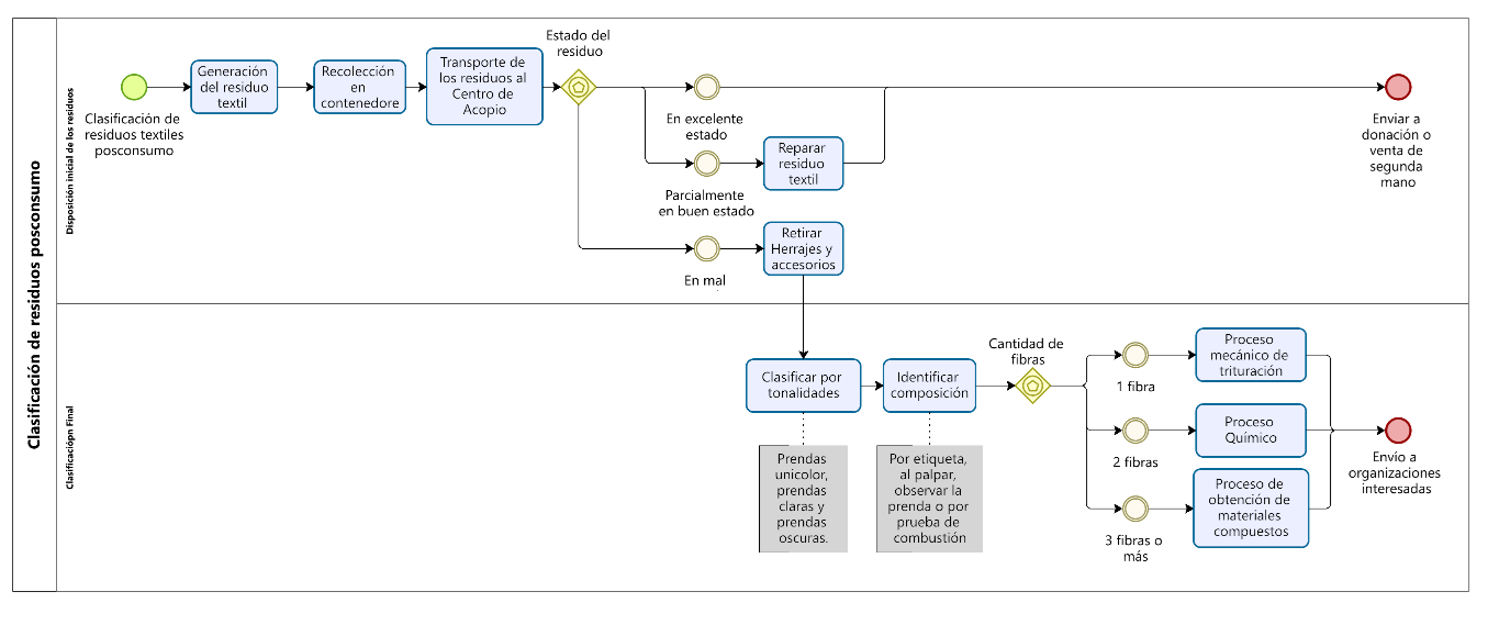 El proceso de clasificación de residuos textiles posconsumo, en un centro de acopio, está determinado por el estado del residuo, el cual puede encontrarse en buen estado total o parcial, o completamente en mal estado. Si se encuentra en buen estado total, la disposición del residuo será la reutilización del producto con la donación a población vulnerable o con la comercialización en tiendas de ropa de segunda mano, sin necesidad de hacer transformaciones.