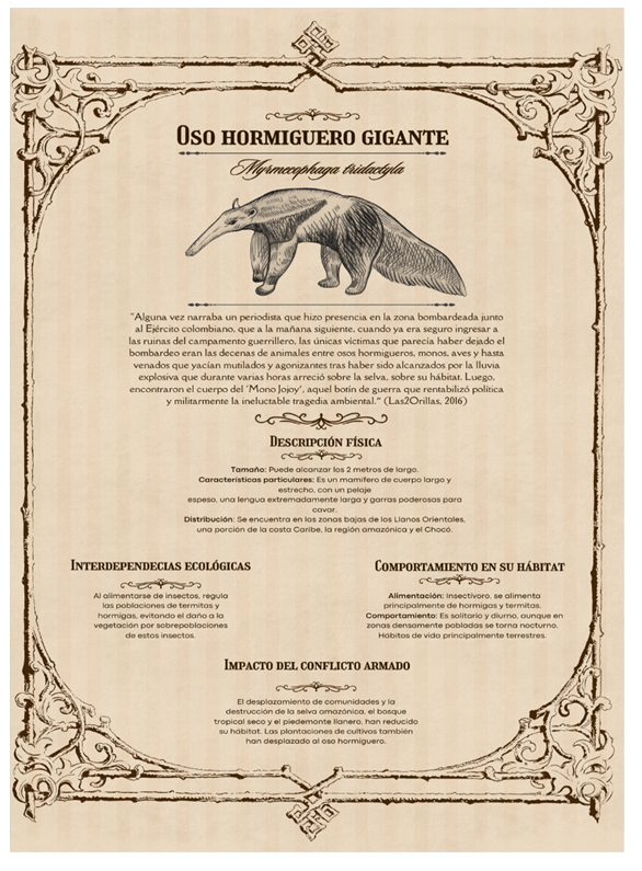 La gente siempre dice: “si no existiera el río, no hubiera pasado eso, porque el río se convirtió en el cementerio, prácticamente”. Pero yo les decía: “no le echen la culpa al río; el río no mató a la gente” (Comisión de la Verdad, 2022, p. 137). Este testimonio, aunque centrado en una entidad no animal, encapsula la idea de inocencia que el bestiario busca transmitir respecto a la fauna silvestre. Los animales no son responsables de las dinámicas de violencia que los envuelven; son, en cambio, víctimas de las mismas fuerzas que afectan a los humanos y los ecosistemas en general. Los relatos de especies como el tigrillo, desplazado por la construcción de represas, o el oso hormiguero gigante, víctima de bombardeos en áreas selváticas, nos enfrentan con la realidad de que estas criaturas, lejos de ser objeto de fascinación o temor, son víctimas de las mismas dinámicas de dominación que afectan a los humanos y a los ecosistemas en general.