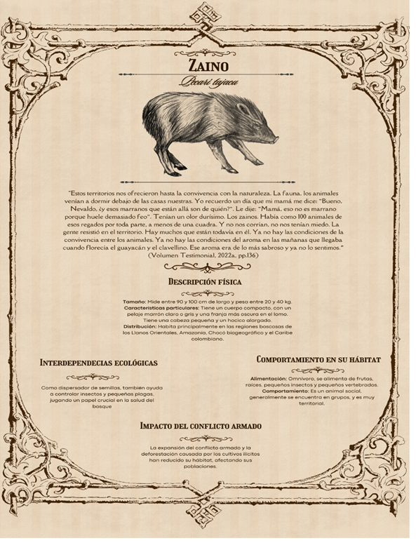 La desaparición de la convivencia refleja cómo las especies están siendo desplazadas o afectadas por la violencia, en el caso de los zainos, que se acercaban sin miedo, conviviendo de forma cercana a las personas muestra una relación en la que la vida del animal tiene un valor propio, independientemente de su utilidad para los seres humanos, la figura 12. (Bestiario 25-26: Pecarí tajacu) Recoge el sufrimiento causado por la desaparición de los zainos y el cambio en el paisaje natural (el aroma de las flores) también es percibido desde el punto de vista de los animales, quienes han perdido su espacio habitual. La pérdida de la fauna y la flora no solo representa una pérdida para los seres humanos, sino también una injusticia para los animales, que ya no pueden vivir libremente en ese territorio.