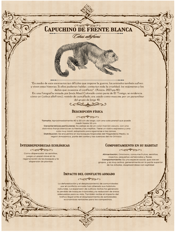 Al igual que los seres humanos, son testigos silentes de la guerra, cargando con cicatrices visibles e invisibles que hablan de la violencia y el sufrimiento que atraviesan en medio del conflicto. También algunos animales como el Capuchino de frente blanca (Figura 13. Bestiario 27-28: Cebus albifrons)