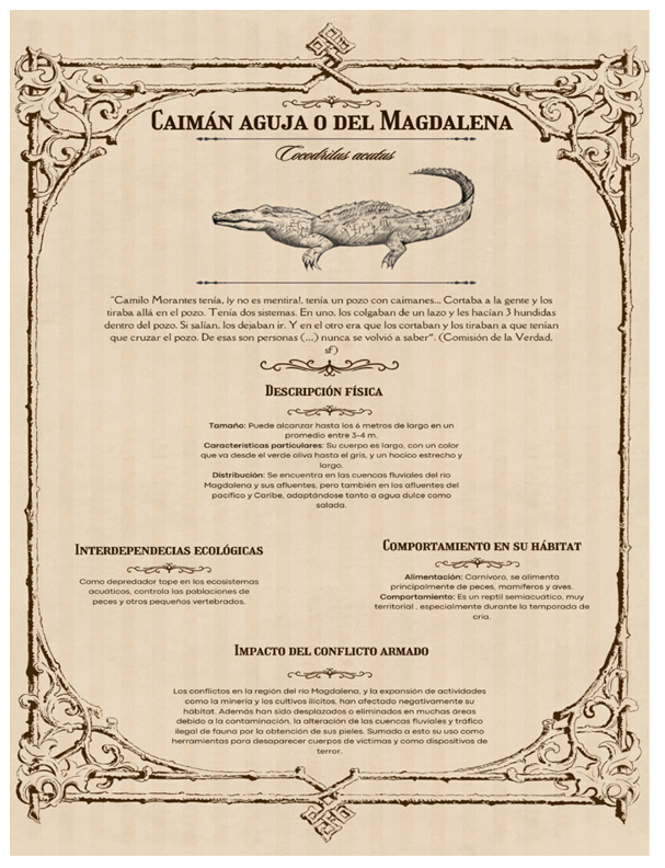El uso de los caimanes como instrumentos de tortura (Figura 3: Bestiario 7-8: Cocodrilus acutus) genera un impacto psicológico devastador en las comunidades humanas. Esta práctica genera miedo y refuerza dinámicas de poder basadas en el terror, afectando tanto a las víctimas directas como a las comunidades cercanas. Aunque los caimanes son depredadores, ser manipulados para actos de violencia humana implica someterlos a un entorno hostil y antinatural, lo que puede causarles estrés y sufrimiento.