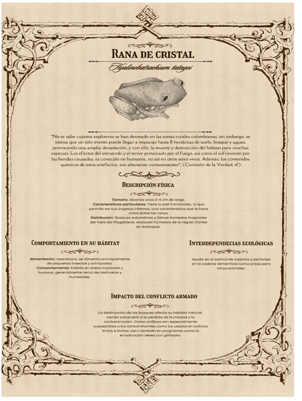 El conflicto social armado en Colombia ha dejado una huella profunda no solo en las comunidades humanas, sino también en los ecosistemas y las especies que habitan en los territorios afectados. Bajo Miradas Policéntricas, se aborda este fenómeno desde una perspectiva integradora, que reconoce a la naturaleza, y en particular a la fauna silvestre, como víctima del conflicto, teniendo en cuenta su relevancia intrínseca más allá de su utilidad para las sociedades humanas. El diseño y desarrollo de un bestiario en este contexto tiene como objetivo visibilizar las formas en que el conflicto ha impactado a las especies, documentar estas afectaciones y explorar narrativas que promuevan la justicia ecológica.