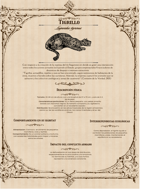 También los lugares determinan posibilidades para algunos animales, la represa se convierte en un símbolo de despojo, en el cual intereses empresariales y estatales se imponen sobre las comunidades y el medioambiente, priorizando el desarrollo económico a corto plazo sobre el bienestar humano y ecológico a largo plazo. Sumado a esto, las dinámicas de amparo sobre los actores que ejercieron violencia directa para el desplazamiento quedan como cicatrices en las comunidades que sufrieron los embates de esta lucha. En el caso del tigrillo (Figura 7. Bestiario 15-16: Leopardus tigrinus) La destrucción de hábitats y la interrupción de ciclos de vida ponen en riesgo la continuidad de muchas especies de animales. Cada muerte o desaparición representa una pérdida irreparable para la vida en su conjunto.