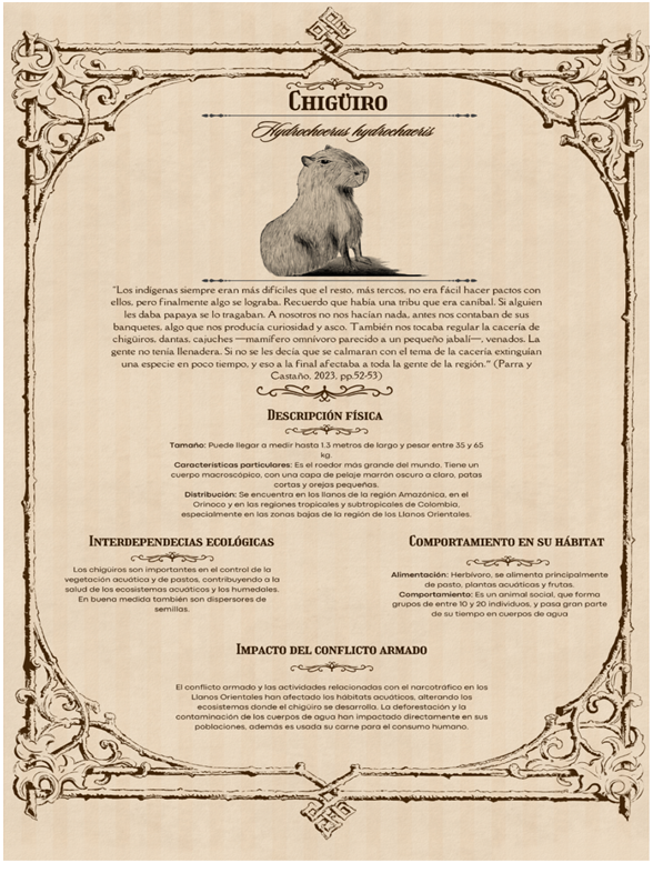 La narrativa presente en (Figura 8. Bestiario 17-18: Hydrochoerus hydrochaeris) incluye una referencia a prácticas culturales indígenas que, aunque generan curiosidad y rechazo desde una perspectiva externa, destacan la diversidad de relaciones humanas con la Naturaleza. La incomprensión de estas prácticas puede generar tensiones culturales y éticas entre diferentes grupos, no obstante, sirve de referencia para analizar cómo ciertas prácticas de unos grupos indígenas, también ponen en riesgo la integridad de los ecosistemas y la supervivencia de ciertas especies de fauna en los territorios en los que coexisten, producto de una violencia estructural que se ejerce sobre las otras naturalezas en su mismo derecho a existir