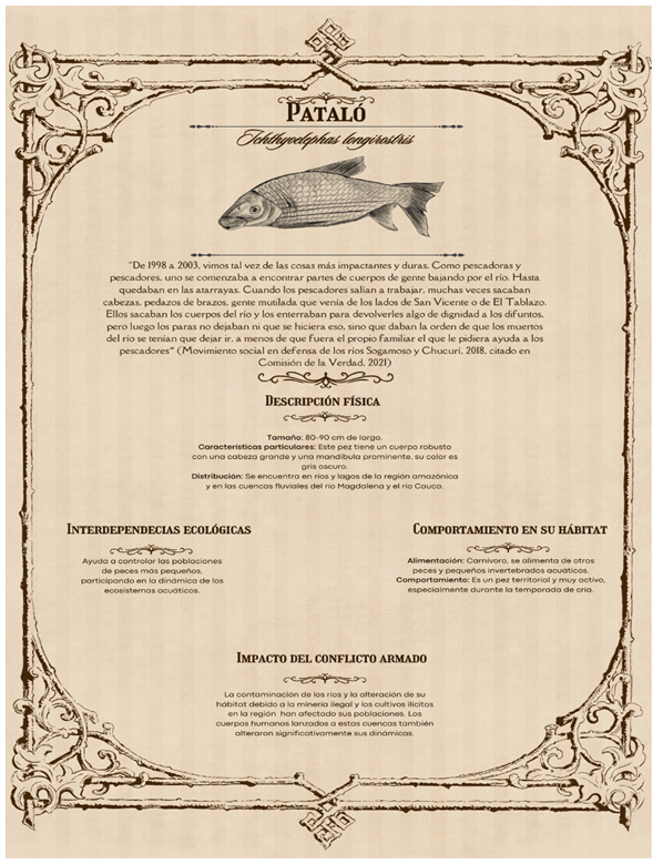 En esencia los ríos también cumplen funciones vitales como corredores biológicos y fuentes de vida para animales y plantas. La Figura 9. (Bestiario 19-20: Ichthyoelephas longirostris) exhibe cómo entre otros el Pataló modifica su existencia, en tanto que la presencia de cuerpos humanos en descomposición en el agua representa una alteración significativa del equilibrio natural del ecosistema fluvial. Esto introduce materia orgánica en descomposición y potenciales patógenos, que afectan la calidad del agua y la vida acuática. La prohibición de enterrar los cuerpos impuesta por los paramilitares demuestra, cómo la violencia no solo tiene un impacto físico, sino también psicológico y cultural. Este acto deshumaniza tanto a los fallecidos como a los vivos que intentan brindarles dignidad, además carga simbólicamente de forma negativa a los peces, cortando las relaciones bioculturales que se tejen alrededor de ellos.)