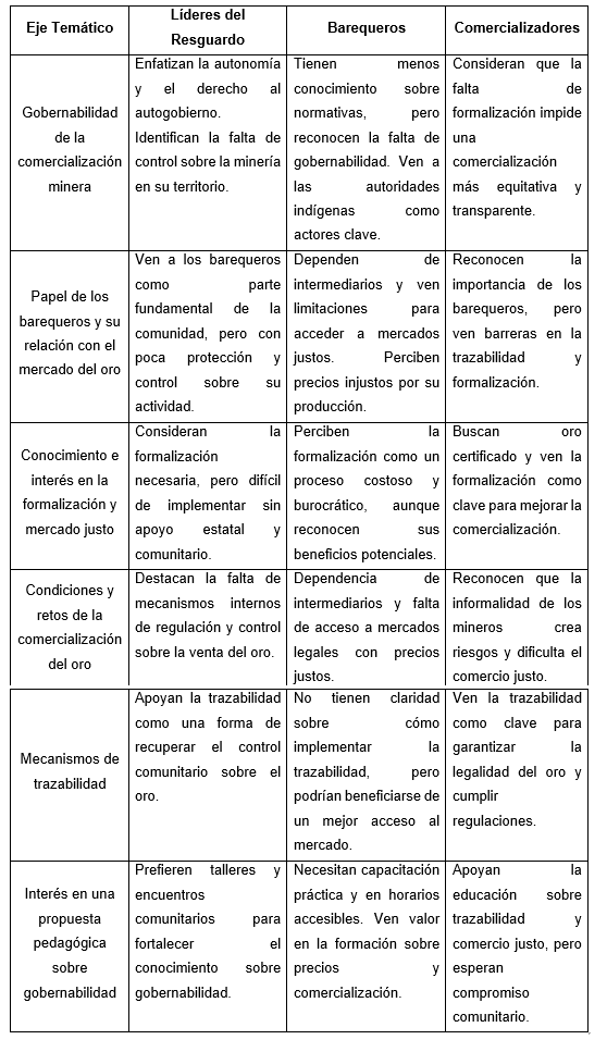 Finalmente, este proceso de investigación permitió identificar patrones comunes en las percepciones y experiencias de líderes indígenas, barequeros del resguardo y comercializadores del oro. A partir del trabajo de campo y los ejes temáticos construidos, se elaboró la siguiente Tabla 1 de patrones, donde se recogen los hallazgos más relevantes según cada actor entrevistado.