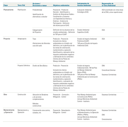 En el mismo sentido, se pautaron métodos cualitativos y cuantitativos para la identificación, valoración y evaluación de impactos, normalizó mecanismos de monitoreo y de auditorías cuantificables con indicadores, puntualizó penalidades y desarrolló la gestión de documentación. También, y junto a la adopción de una nueva regionalización del país –las ecorregiones–, incluyó instrumentos de evaluación y gestión ambiental en la etapa del mantenimiento y la operación de las obras viales, puesto que la anterior versión se restringía a las fases proyectivas y constructivas (Figura 3).