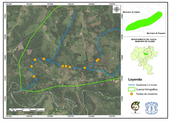 Figura 1. Ubicación de la zona de estudio en la vereda La Viuda municipio de Cajibío, en el Departamento del Cauca