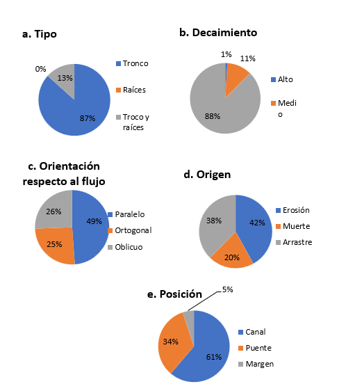 En relación a la orientación de las piezas de madera, se observó una dominancia de la categoría paralela al flujo, seguida de ortogonal y oblicua (Figura 2c), resultados similares a los obtenidos por Ulloa et al. (2010) en los ríos Pichún y Vuelta de Zorra, y por Baillie et al. (2008) en el río Whirinaki en Nueva Zelanda, la disposición paralela influye en la dinámica hidrológica y puede favorecer la permanencia de la madera en el cauce e influir en la disponibilidad de refugios y zonas de retención de materia orgánica para la biota acuática.