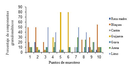 Granulometría: la composición granulométrica en los puntos de muestreo, tuvo una distribución heterogénea con mayores porcentajes para guijarros, bloques y limo en algunos de los puntos de muestreo (Figura 4).