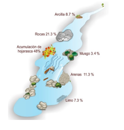 La determinación del tipo de sustrato en un lecho es crucial para la flora marginal y la fauna bentónica específica (Roldán y Ramírez, 2008). los lechos rocosos y pedregosos, libres de contaminación, albergan una fauna diversa y acumulan residuos vegetales que aumentan la diversidad; los fondos arenosos albergan pocas especies y baja abundancia, mientras que los sustratos pedregosos en zonas de rápidos tienen una fauna menos diversa que los rocosos, y los sustratos con hojarasca, al ofrecer más recursos, presentan alta riqueza de especies y mayor densidad de organismos (Rivera, 2004; Burdet y Watts, 2009).