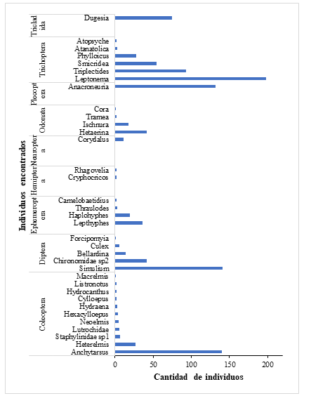 Se encontró que los taxa Anacroneuria, Anchytarsus, Hetaerina y Leptonema estuvieron presentes en todos los microhábitats evaluados a lo largo de todo el tramo de la quebrada, los demás grupos se registraron con densidades bajas o de forma ocasional.