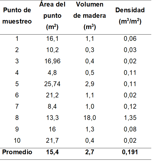 Tabla 1. Volumen y densidad de madera encontrados en los 10 puntos de muestreo a