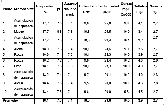 Los parámetros fisicoquímicos se midieron en los diferentes microhábitats de cada punto (hojarasca, rocas, arena, limo, arcilla, musgo), con el fin de captar las variaciones locales en flujo, oxigenación y retención de materia orgánica, que influyen directamente en la distribución y abundancia de macroinvertebrados acuáticos.