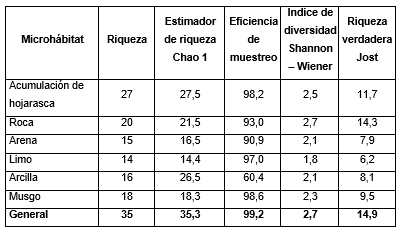 Tabla 4. Valores calculados para los índices de diversidad por microhábitat en