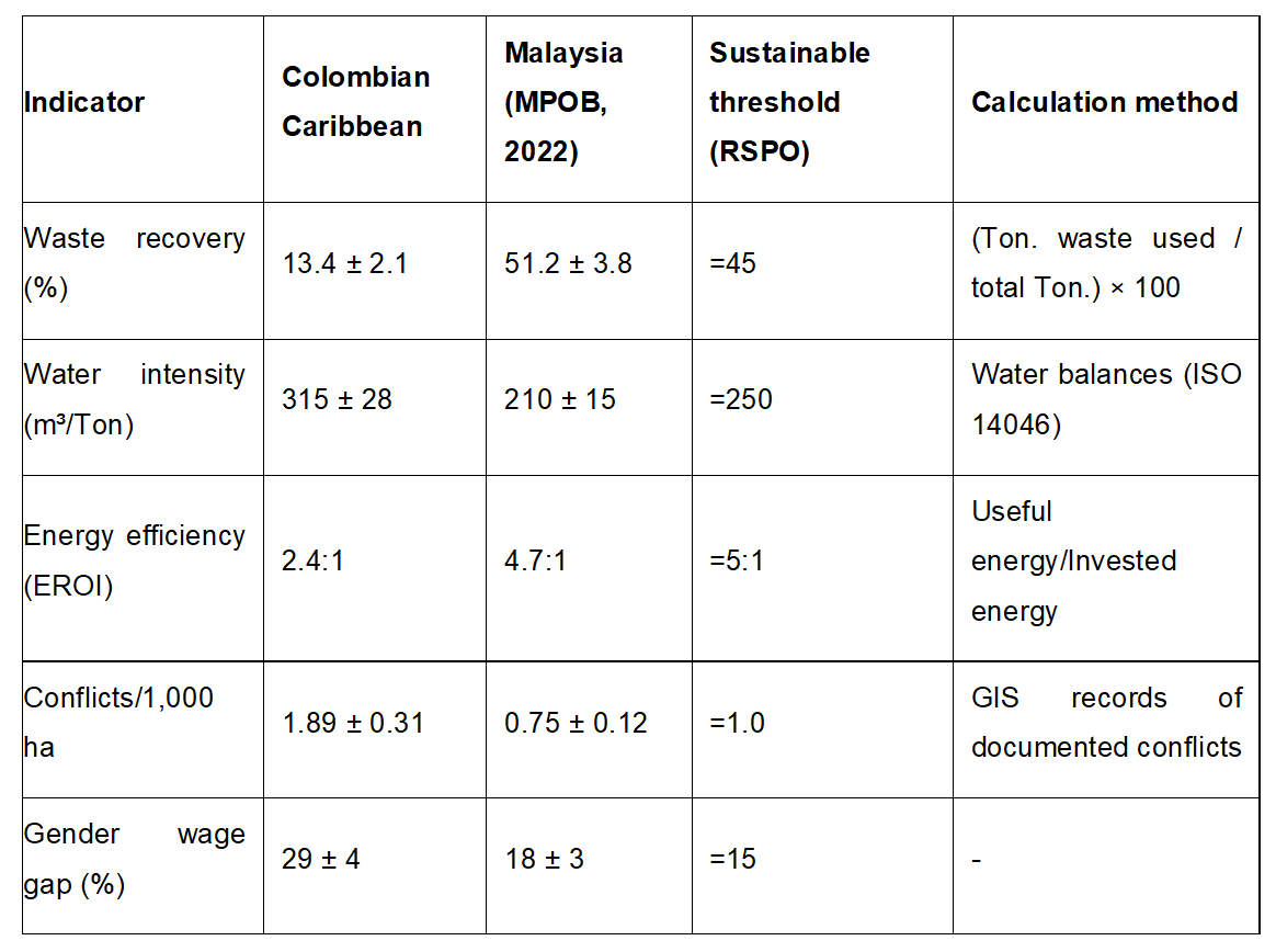 Table 3 summarizes the key metabolic indicators compared to international standards, highlighting that only 13.4% of waste is recovered in the current production system, compared to 51% reported in certified plantations in Malaysia (MPOB, 2022). This circularity gap represents not only a waste of valuable resources but also a missed opportunity to reduce environmental impacts and generate local added value (Rodríguez and Martinez, 2019; Reina, 2013).