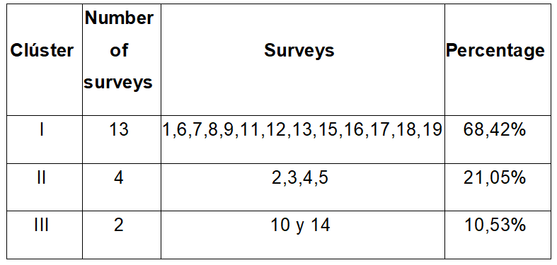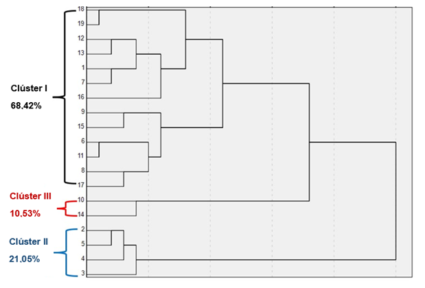 As shown in Table 2, Group I includes 13 surveys (1, 6, 7, 8, 9, 11, 12, 13, 15, 16, 17, 18, and 19), Group II includes 4 surveys (2, 3, 4, and 5), and Group III includes 2 surveys (10 and 14), representing 68.4%, 21.0%, and 10.5% of the total, respectively. These clusters reflect differing conditions related to agrochemical input use and residue management practices.