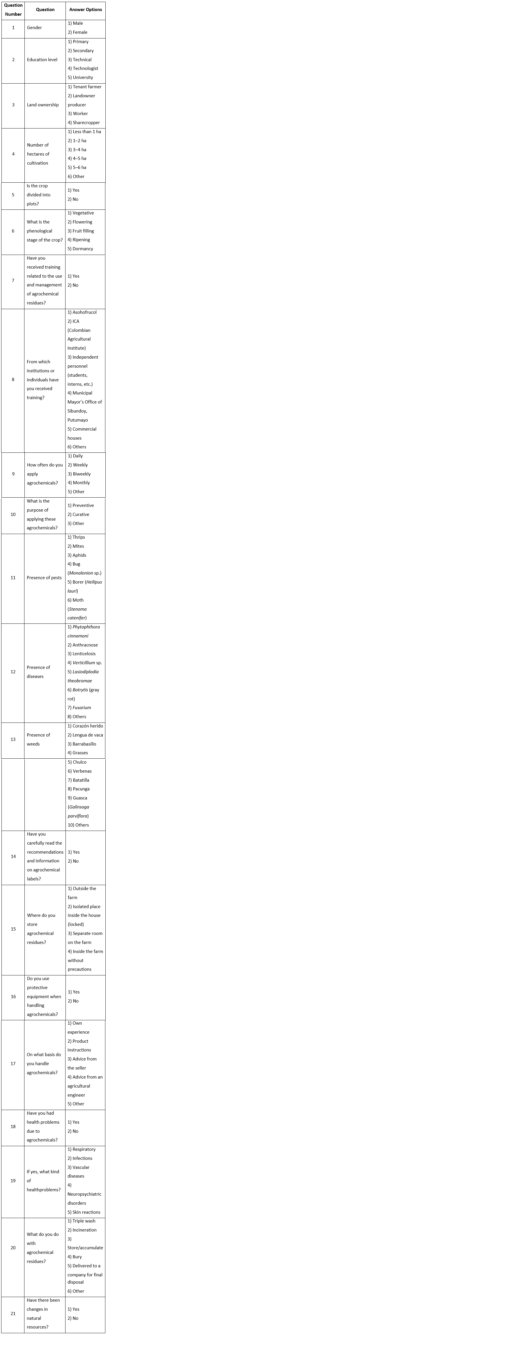Table 1 presents the survey administered to avocado producers, which describes the management practices related to agrochemical residues on each farm