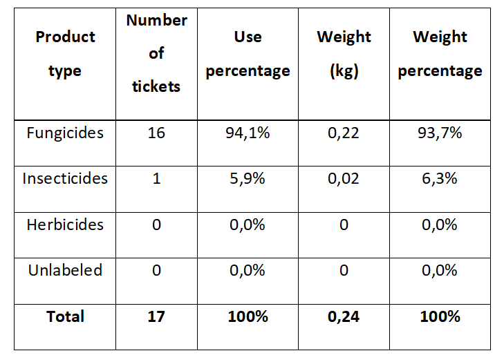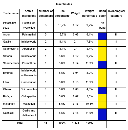 Table 7 shows that, of the 17 sachets collected, classified, and weighed, 94% corresponded to fungicides, which represent the most frequently used inputs when compared to insecticides (5.9%). The total weight of sachet waste amounted to 0.24 kg. The higher use of fungicides, both in containers and sachets, is associated with an increase in application frequency and higher doses required for disease control. Fungicide application constitutes an effective, rapid, practical, and cost-effective management option. However, as occurs with weeds and insects, target fungal populations may develop resistance over time (Vielba et al., 2020).
