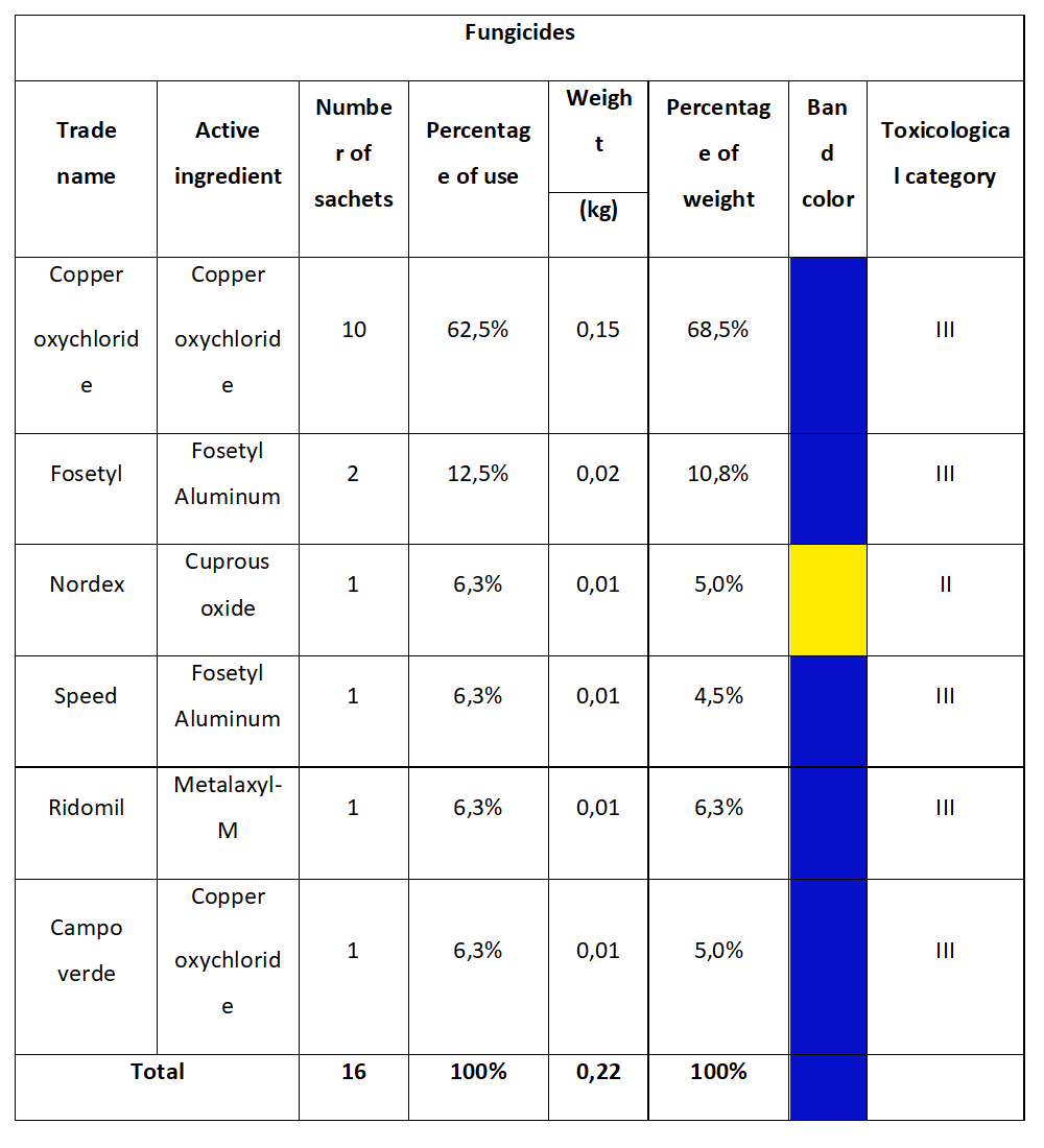 The fungicides packaged in sachets comprise six inputs containing four active ingredients, with copper oxychloride (68.8%) and fosetyl aluminum (18.8%) being the most frequently used. Both active ingredients fall within toxicological category III (moderately toxic), accounting for 83% of the inputs, while toxicological category II (highly toxic) represents 17%.