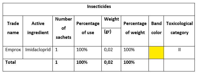 Finally, the toxicological categorization of insecticides based on the identified sachets is presented in Table 9.