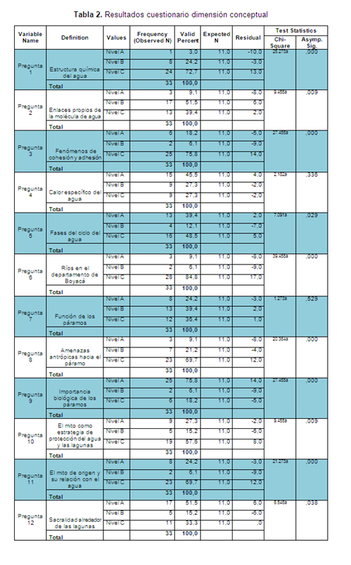 Al analizar los resultados obtenidos en el conjunto de preguntas que daban cuenta de la dimensión conceptual, se observa que en todas las preguntas en que se establecieron diferencias estadísticamente significativas, el nivel C de competencia predominó. Esto implica que los participantes tienen conceptos claros en lo referente al agua desde el punto de vista químico y físico, es decir aplican teorías aprendidas y las transpolan para comprender que el agua es una molécula, que está unida por enlaces covalentes y que entre sus propiedades físicas figuran la cohesión y la adhesión. Caso similar ocurre con el agua desde el punto de vista ecológico. Se comprenden las fases que conforman el ciclo del agua, la riqueza hídrica en el departamento de Boyacá y la responsabilidad que ello implica, las consecuencias que traen para las especies endémicas actividades como quemas y extensión de cultivos en los ecosistemas de Páramo. Sin embargo, cuando se cuestiona sobre los sistemas socio-culturales alrededor del agua, las respuestas puntúan en niveles A y B de competencia. Así cuando se pregunta sobre la importancia de los páramos en términos de supervivencia para la especie humana, se reitera que se adjudica a las plantas y animales, desconociendo la función de los ecosistemas de alta montaña en la regulación hídrica; o cuando se cuestiona sobre el carácter sacro de las lagunas y los páramos para los Muiscas, simplemente se tergiversa la palabra adoración y se convierte en sinónimo de fiesta.