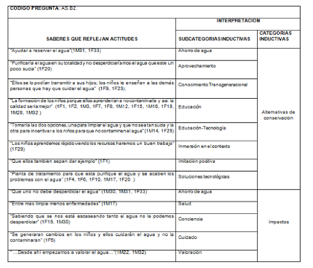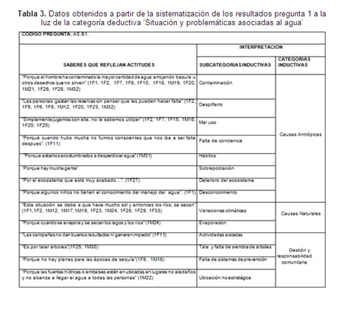 Producto de las respuestas de los niños y niñas se establecen 3 categorías inductivas que resumen las causas generales posibles que engloban las situaciones y problemáticas relacionadas con el agua, a saber: causas antrópicas, causas naturales, y gestión y responsabilidad comunitaria. Apartes de las respuestas de los participantes se muestran en la Tabla 3.