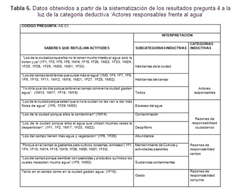 Se propuso un enunciado en que se ofrecían cifras del gasto de agua en las zonas urbanas y en el sector agrícola que representa una de las principales actividades económicas de los pobladores de zonas rurales. A propósito se indagó sobre la percepción de los niños y niñas frente a las responsabilidades de los actores sociales respecto al agua. La Tabla 6 sintetiza los principales hallazgos.