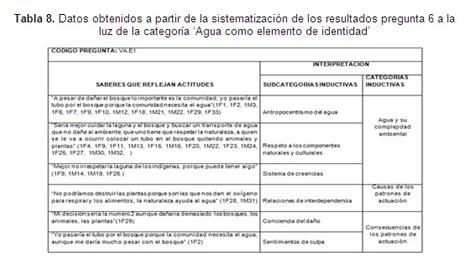 Bajo las pretensiones de identificar las actitudes de los estudiantes hacia el agua entendida desde su complejidad ambiental, se planteó que el suministro de agua para una comunidad aislada implicaba generar daño al pasar un tubo por un bosque y afectar una laguna sagrada para una cultura indígena ancestral, las opiniones se dividieron fuertemente según los resultados de la Tabla 8.