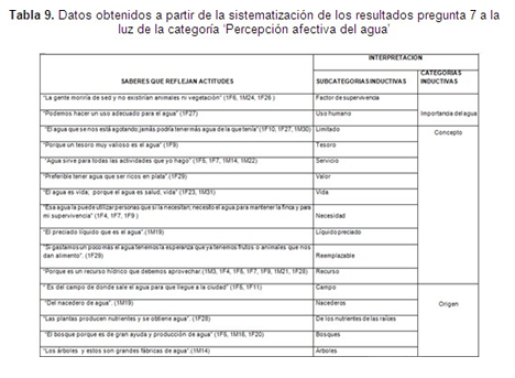 En la Tabla 9 se observan las percepciones en términos de definición, importancia, origen y usos y prácticas alrededor del agua.