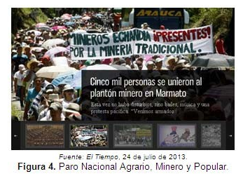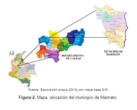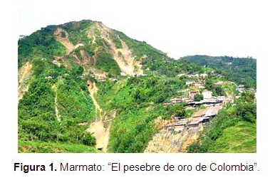 Es así como en el contexto del Eje Cafetero colombiano, declarado “Paisaje Cultural Cafetero - Patrimonio de la humanidad”, 11 municipios integran los distritos mineros para el desarrollo de megaproyectos transnacionales (UPME, 2005). Entre dichos distritos se encuentra el municipio de Marmato (Caldas), conocido también como “El pesebre de oro de Colombia” (ver Figura 2), donde sus habitantes han practicado la minería tradicional de oro, base de la historia, la cultura, el patrimonio y la economía; por tanto, de la visión de desarrollo local.