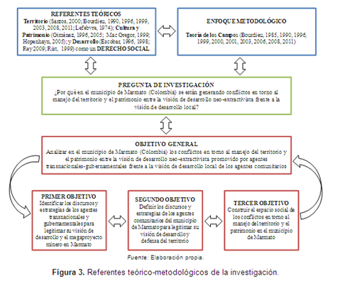 En virtud de lo anterior, la investigación “¿Neo-extractivismo o desarrollo local? Conflictos territoriales y patrimoniales en el pueblo minero de Marmato (Colombia)” tuvo como referentes teóricos los conceptos y procesos sociales de “territorio”, “cultura”, “patrimonio” y “desarrollo” como un derecho social; y como enfoque metodológico la “teoría de los campos” que exigió emplear técnicas de investigación cualitativas, cuantitativas y mixtas.