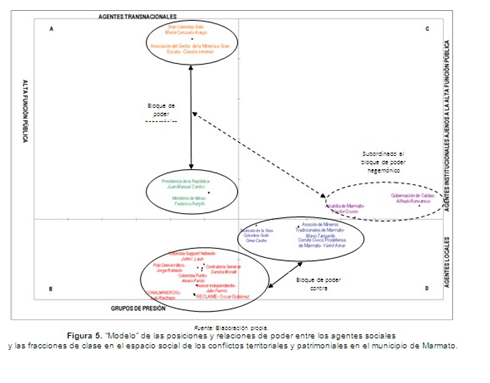 To legitimate the neo-extractivist development viewpoint, the transnational- governmental agents have developed and implemented different speeches and conservative strategies around the illusion or idea that economic development and sustainable development only can be led by private and transnational capital. However, community agents have also developed speeches and resistance strategies from the people in defense of their territory, cultural heritage and local development viewpoint based on traditional mining with the support of different social sectors. But territorial and patrimonial conflicts in addition to facing two visons of development are facing different social agents with different capitals and interests, who compete for the legal authority to preserve or transform the current order in Marmato.