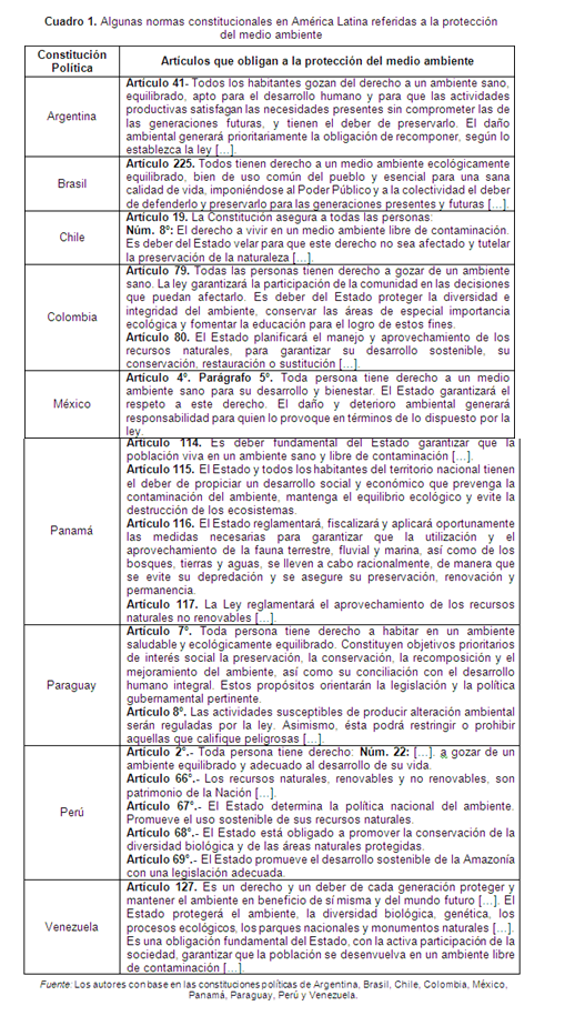 Ya desde hace dos décadas, no solo Colombia sino los Estados en general, han reconocido la urgencia de realizar acciones concretas y efectivas para promover el desarrollo sostenible, es decir, hacer uso de los recursos sin poner en peligro la existencia de las generaciones futuras. Un ejemplo de ello es la inclusión de aspectos medioambientales en las constituciones políticas de los diferentes Estados, y en América Latina “la mayoría de los países hicieron cambios […], en los que hubo un mayoritario reconocimiento constitucional a la materia ambiental, tema que, salvo excepciones, no había aparecido, hasta el momento, de manera tan notoria en las constituciones” (Acuña, 2010, p. 113). Esto es relevante desde el punto de vista político, pues se entiende que la inclusión de estas normas ambientales a nivel constitucional es debido a la importancia, urgencia y al consenso de los pueblos por mejorar el estado de crisis en materia ambiental. Las cartas políticas contienen los principios fundamentales para la creación y organización de los poderes públicos además de las normas generales que enmarcan la totalidad del ordenamiento jurídico, así como las garantías individuales y sociales “que deben ser respetados por la totalidad del sistema jurídico” (Vázquez, 1975, p. 589). Entonces, los Estados que referencian normas medioambientales desde la misma Constitución, admiten la superioridad de la misma, razón por la que debe ser desarrollada y garantizada por el resto del sistema jurídico. En el Cuadro 1 se hace una síntesis de algunas normas constitucionales en América Latina que han incluido los países en sus cartas