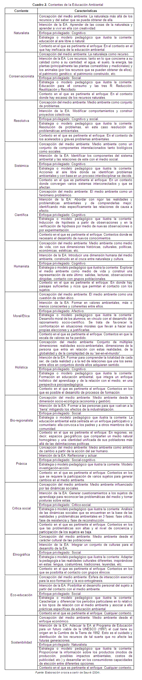En otras palabras, la EA permite al individuo evaluar analítica y reflexivamente su posición y conducta respecto del medio. La EA es un proceso de formación que busca despertar la conciencia ambiental y que las personas se identifiquen con los graves problemas ambientales (Cugler, 2010) por los que se encuentran pasando las sociedades y el planeta. Desde la perspectiva de Copello, Nunes, Langoni & Russo (2008, p. 44), la EA “consiste en un modo de ver el mundo, que evidencia las interrelaciones y las interdependencias de los diversos elementos que constituyen y mantienen la vida”. Para ello se ha buscado emplear estrategias desde diversos enfoques, las cuales tienen una gran multiplicidad de manifestaciones (Gutiérrez & Pozo, 2006, p. 22; González & Valdez, 2012) haciendo de la EA una dimensión compleja (Sauvé, 2003). Sauvé (2004) hace un recorrido de las corrientes de la educación ambiental y que es necesario analizar e interpretar. De acuerdo a la autora, las corrientes para la educación ambiental se han elaborado en dos espacios de tiempo: las primeras corresponden a la década de los setenta y ochenta, y las segundas a necesidades y requerimientos actuales. Las antiguas son: a) corriente naturalista, b) corriente conservacionista/recursista, c) corriente resolutiva, d) corriente sistémica, e) corriente científica, f) corriente humanista y g) corriente moral/ética. Las nuevas son: h) corriente holística, i) corriente bio-regionalista, j) corriente práxica, k) corriente crítica, l) corriente etnográfica, m) corriente de la eco-educación, y n) corriente de la sostenibilidad/sustentabilidad. Las características de cada una de las corrientes se expresan en el Cuadro 2.