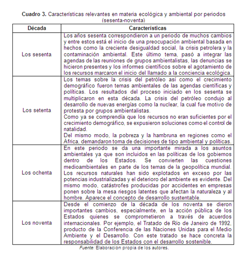Sauvé (2004) hace un desarrollo importante de las corrientes de la EA y cabe destacar que no hay un criterio homogéneo para la gestión de estos procesos. Es necesario conocer el grupo de sujetos, su contexto, intereses y necesidades, así como el tipo de sociedad. La aplicación de un modelo de EA depende de las circunstancias propias en las que se encuentran inmersos los sujetos de aprendizaje, es decir, a los contextos de los educandos y al modelo de sociedad del momento. En el Cuadro 3 se exponen las características vitales de cada década en materia ecológica y ambiental desde los años sesenta hasta los noventa a fin de establecer las relaciones entre las corrientes que se han desarrollado y las cualidades propias de cada sociedad. Si bien los años sesenta fue el periodo inicial en la construcción de nuevas perspectivas en muchos campos de la vida del hombre, solo hasta los años setenta se da una preocupación real y relevante por los asuntos ambientales. Es precisamente en este periodo que la educación construye modelos de enseñanza como los expuestos por Sauvé (2004). Por ello, las primeras corrientes se fundamentaron en asociar los tópicos medioambientales con problemáticas y recursos naturales, precisamente cuando se evidenció la escasez de los segundos y los efectos de los primeros. Posteriormente, las corrientes incluirán aspectos económicos y políticos, precisamente porque los años ochenta y noventa correspondieron a cambios de ese tipo.
