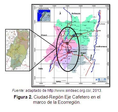 La Ciudad-Región: para Boisier (2006) las ciudades se integran en sistemas que existen en una relación de naturaleza simbiótica ciudad-territorio circundante, es decir, entre la ciudad y su región. Entendiendo esa condición, se propuso la conformación de la Ciudad-Región Eje Cafetero como un sistema de tres ciudades intermedias que comparten rasgos históricos, cuentan con dinámicas urbanas y tienen un espacio territorial de alto interés de análisis dado que actúan como centro de una región (parten de un hecho metropolitano), lo cual resulta de cierta forma sesgado, en la medida en que se sustentan en los aspectos urbanos denotando una jerarquización vertical en torno a las ciudades núcleo.