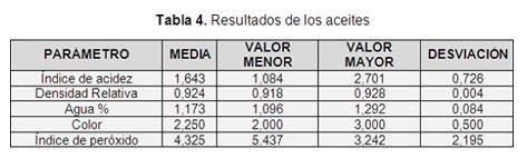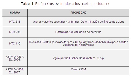 Se evaluó el índice de acidez y densidad relativa de acuerdo a las Normas Técnicas Colombianas (NTC) y el contenido de agua y el color según las normas de la American Society for Testing and Materials (ASTM), como se muestra en la Tabla 1.