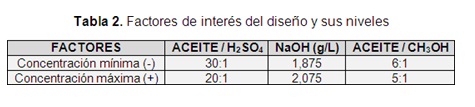 La esterificación ácida fue realizada usando ácido sulfúrico de calidad analítica durante 90 minutos a 60°C, La transesterificación básica se realizó con hidróxido de sodio de alta pureza. Se usó un diseño de experimentos factorial 23, en el cual los factores de interés estudiados fueron la relación aceite-ácido (A), concentración de hidróxido de sodio (B) y relación aceite-metanol (C). Los niveles evaluados para cada factor se muestran en la Tabla 2 (Gumus, 2010). Cada tratamiento se realizó por duplicado, es decir, se realizaron 2x23 = 16 corridas experimentales.