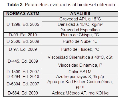 Se determinó el volumen de biodiesel obtenido para calcular el rendimiento de la reacción. Los resultados obtenidos fueron analizados de acuerdo a las normas ASTM. El análisis estadístico del diseño de experimentos se efectuó por medio del análisis de