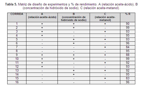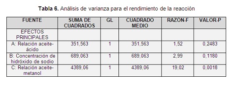 La Tabla 6 muestra la influencia que presentan los factores en la reacción. La relación aceite-metanol es el factor que presenta una influencia significativa en la reacción favoreciéndose para bajas concentraciones de metanol, a las cuales se obtienen rendimientos del 90%. Los otros factores de interés (concentración de ácido sulfúrico e hidróxido de sodio) no influyen significativamente en el rendimiento de la reacción en el rango evaluado.
