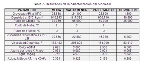 La Tabla 7 muestra los resultados de la caracterización. El biodiesel producido a partir de los aceites residuales tiene una buena calidad, sin embargo algunos parámetros como gravedad API, punto de chispa, la viscosidad cinemática y el contenido de agua no cumplieron los estándares, lo cual se puede evitar realizando un eficiente pretratamiento del aceite antes de su uso en la esterificación.