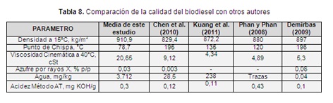 Otros autores han evaluado el biodiesel obtenido a partir de aceites residuales de cocina, estos parámetros comparados con los resultados de este estudio se muestran en la Tabla 8. La viscosidad se relaciona con los triglicéridos no convertidos que deben ser separados, y el punto de chispa es inferior a los demás, y de acuerdo a Berkemeier et al. (2006), es causado por la presencia del metanol en exceso no separado, disminuye 50°C con solo incrementar el contenido de metanol en el éster en un 0,5%.